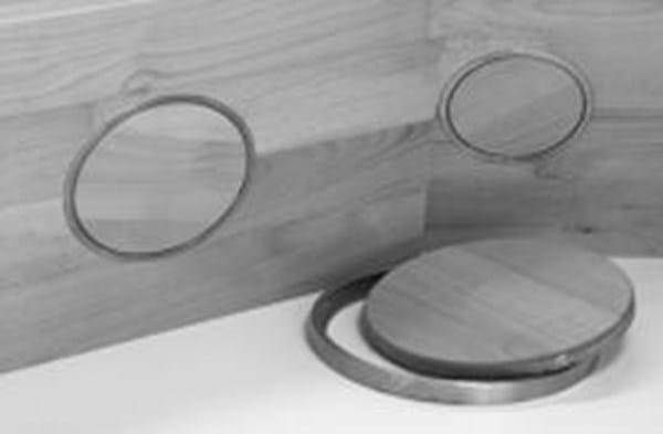 Bushing with frame in brass colour and cover/lid in beech.