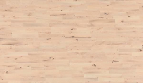The uniform structure with white to reddish heartwood and the red-brown grain pattern provide a hard-wearing floor with a classic appearance. Slightly white toned by using the colour Nordic a Scandinavian touch is added to the floor.