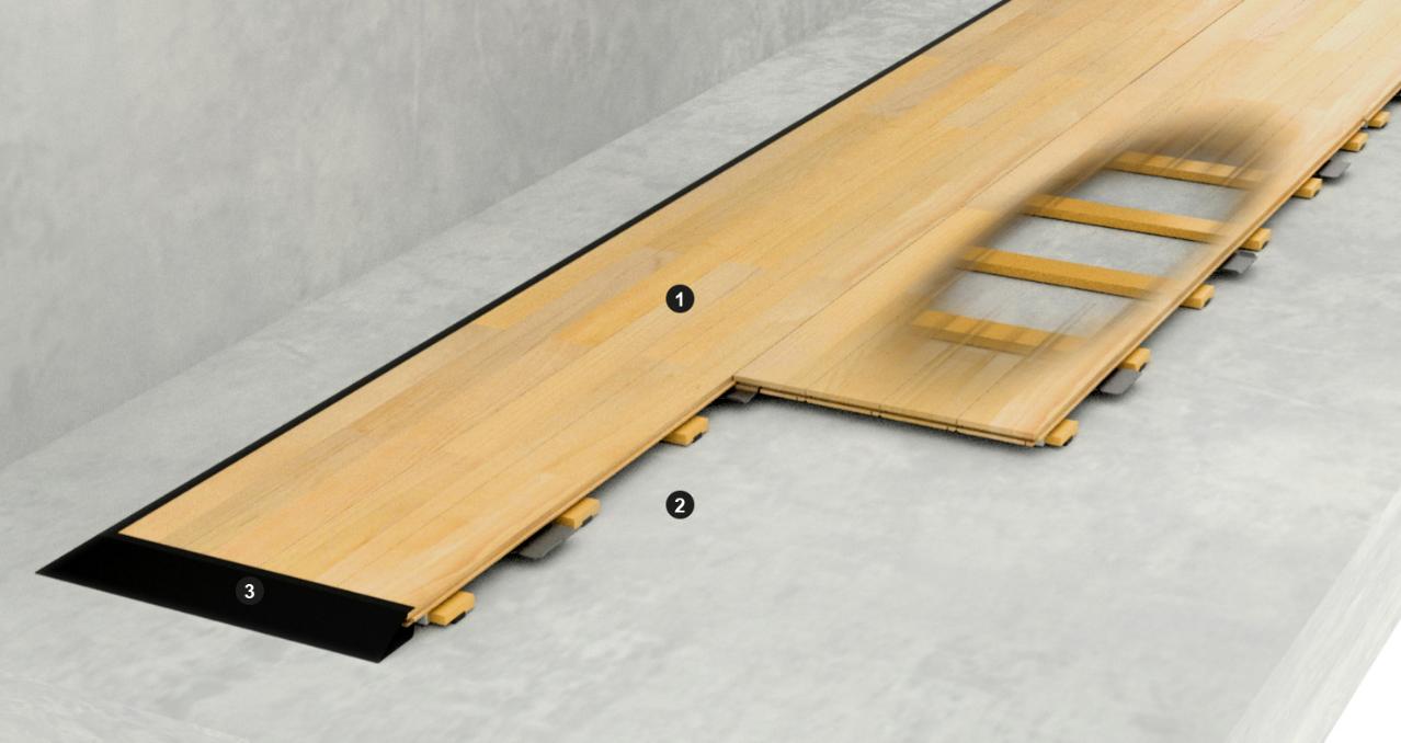 The floor panels are easily assembled and locked together with pre-mounted metal brackets on each panel. Lengthwise, all panels have a tongue and groove connection. The ends of the panels are joined using slip tongues. A supporting and protecting transition ramp forms a strong edge of the floor perimeter.