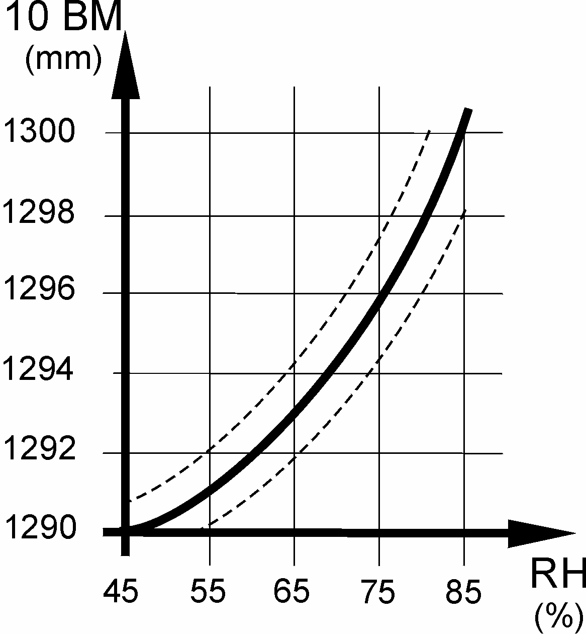 The graph in fig. 4 illustrates the 10-board rule in relation to the relative air humidity for 129 mm (5'') floorboards. E.g. an expected relative humidity of max. 65 % RH will normally require a 10- board measurement of approx. 1294 mm (4′ 3″).